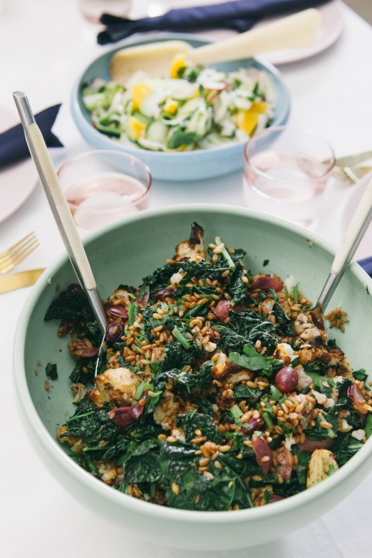 Alternatively, you can roast the kale if you prefer a crispier texture. Assemble the cauliflower, grapes, kale and farro in a serving bowl.