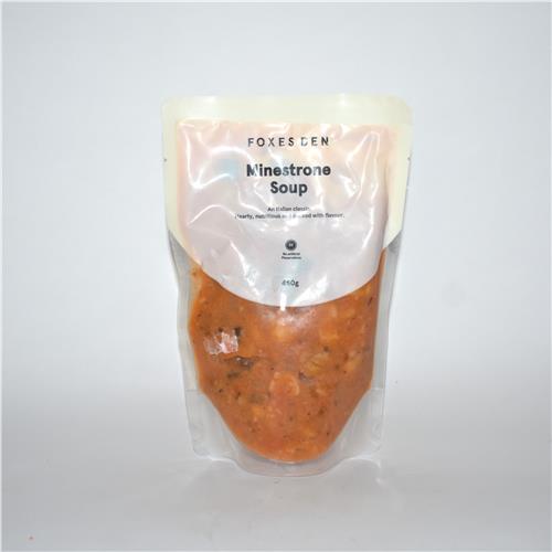 Ingredients: Chicken stock (water, natural chicken stock), diced tomato, cannellini beans, potato, canola oil, pasta (durum wheat semolina), carrot, onion, zucchini, celery, lemon juice, spinach, bacon, tomato paste, garlic, extra virgin olive oil, black pepper, chilli flakes, Himalayan pink salt, bay leaves, thyme, oregano.