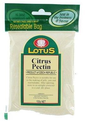 Lotus Citrus Pectin is a gluten free, nutritional fibre source. Extracted from citrus peel, use it to set jellies, jams and marmalades. Lotus Citrus Pectin is sourced from Mexico and packed in Australia. It comes in 100gm re-sealable oxygen barrier bag to preserve freshness. Lotus Citrus Pectin is gluten free, dairy free, nut free, lactose free, soy free and vegan. INGREDIENTS: Vegetable gum extracted from citrus peel.