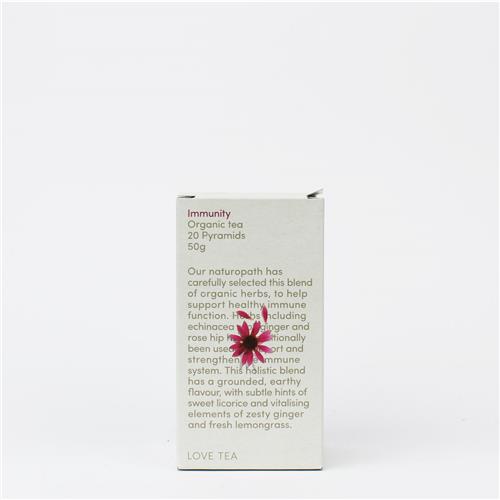 Love Tea’s Immunity Tea is a blend of organic herbs, carefully selected by their naturopath to help support healthy immune function. Herbs including echinacea root, ginger and rose hip have traditionally been used to support and strengthen the immune system. This holistic blend has a grounded, earthy flavour, with subtle hints of sweet licorice and vitalising elements of zesty ginger and fresh lemongrass. This blend is caffeine free. Place 1 pyramid into a cup (250ml) and add boiling, filtered water at 75ºc–85ºc. Allow to infuse for 3–5+ minutes, and then remove the bag and serve.