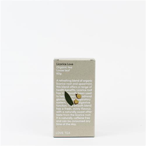 Love Tea’s Licorice Love Tea is a refreshing blend of organic licorice root and spearmint. This blend offers a range of health benefits. Licorice root has traditionally been used to help support the adrenal glands and the respiratory system, and aid digestive function. This smooth blend has a fresh, minty flavour, with a naturally sweet after taste from the licorice root. It is naturally caffeine free and can be consumed any time of the day. This blend is caffeine free.