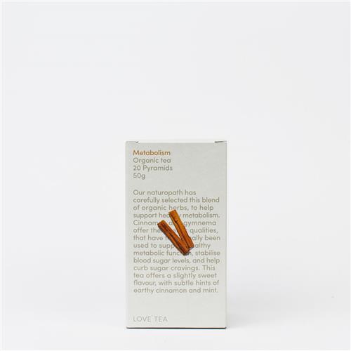 Love Tea’s Metabolism Tea is a blend of organic herbs, carefully selected by their naturopath to help support healthy metabolism. Cinnamon and gymnema offer therapeutic qualities, that have traditionally been used to support healthy metabolic function, stabilise blood sugar levels, and help curb sugar cravings. This tea offers a slightly sweet flavour, with subtle hints of earthy cinnamon and mint.